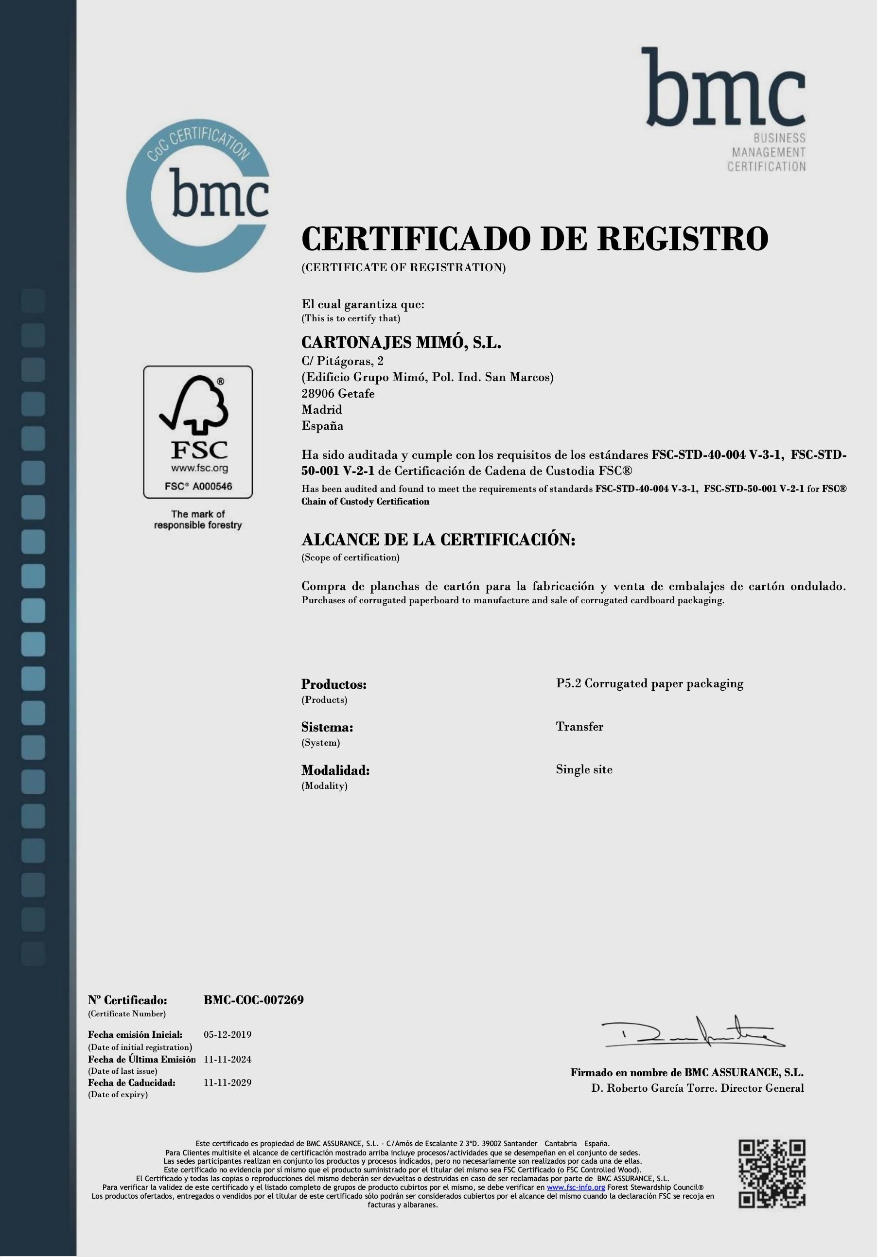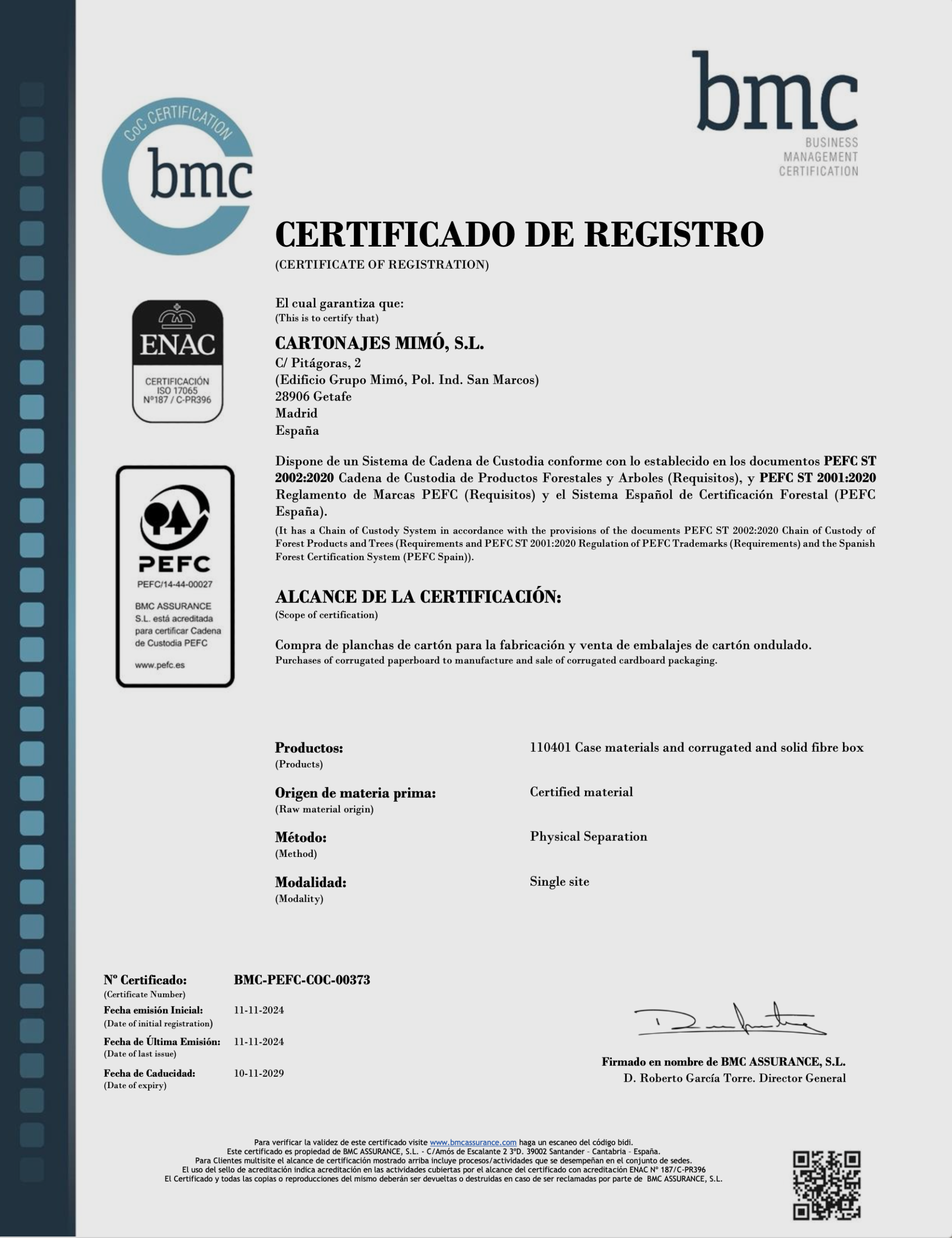 En Mimopack nos hemos certificado en ambos sistemas de gestión, y hemos dado un paso más en nuestro empeño de usar materiales respetuosos con el medio ambiente. De esta forma, nos comprometemos con la gestión forestal sostenible, con el objetivo de promover una gestión forestal responsable, beneficiosa socialmente y económicamente viable. Nuestros clientes pueden beneficiarse del valor añadido que los productos certificados tienen y que pueden conferir mayor ventaja competitiva en los mercados actuales, cada vez más exigentes.